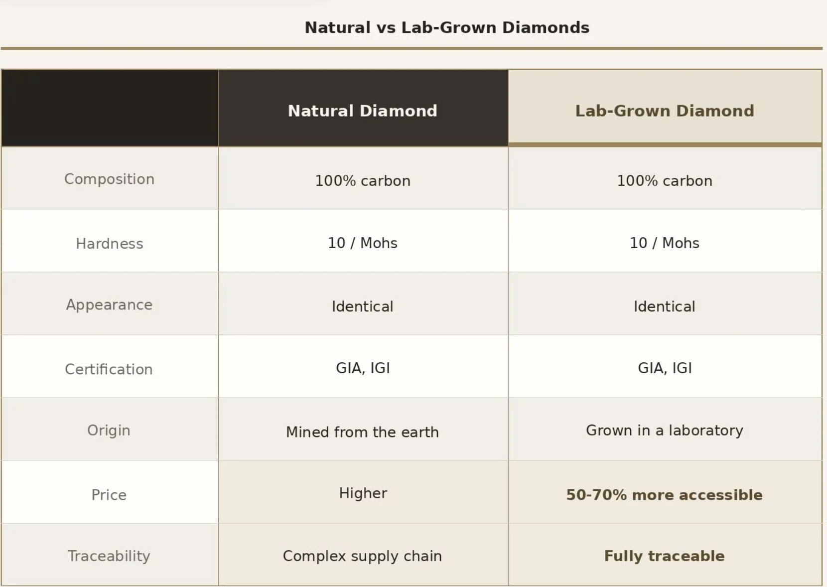 At a chemical and physical level, lab-grown and natural diamonds are identical. Both are pure carbon crystals. Both register a 10 on the Mohs hardness scale (the hardest rating possible). Both are cut, polished, and graded using exactly the same international standards by the same certification bodies, including GIA and IGI.